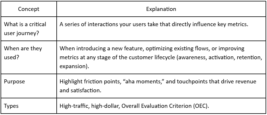 What it is: A measurable sequence of interactions tied to business goals. When to use it: During feature launches or lifecycle stages like acquisition and retention. Purpose: Identify value realization points and opportunities. Types: High-traffic, high-dollar, and OEC journeys.